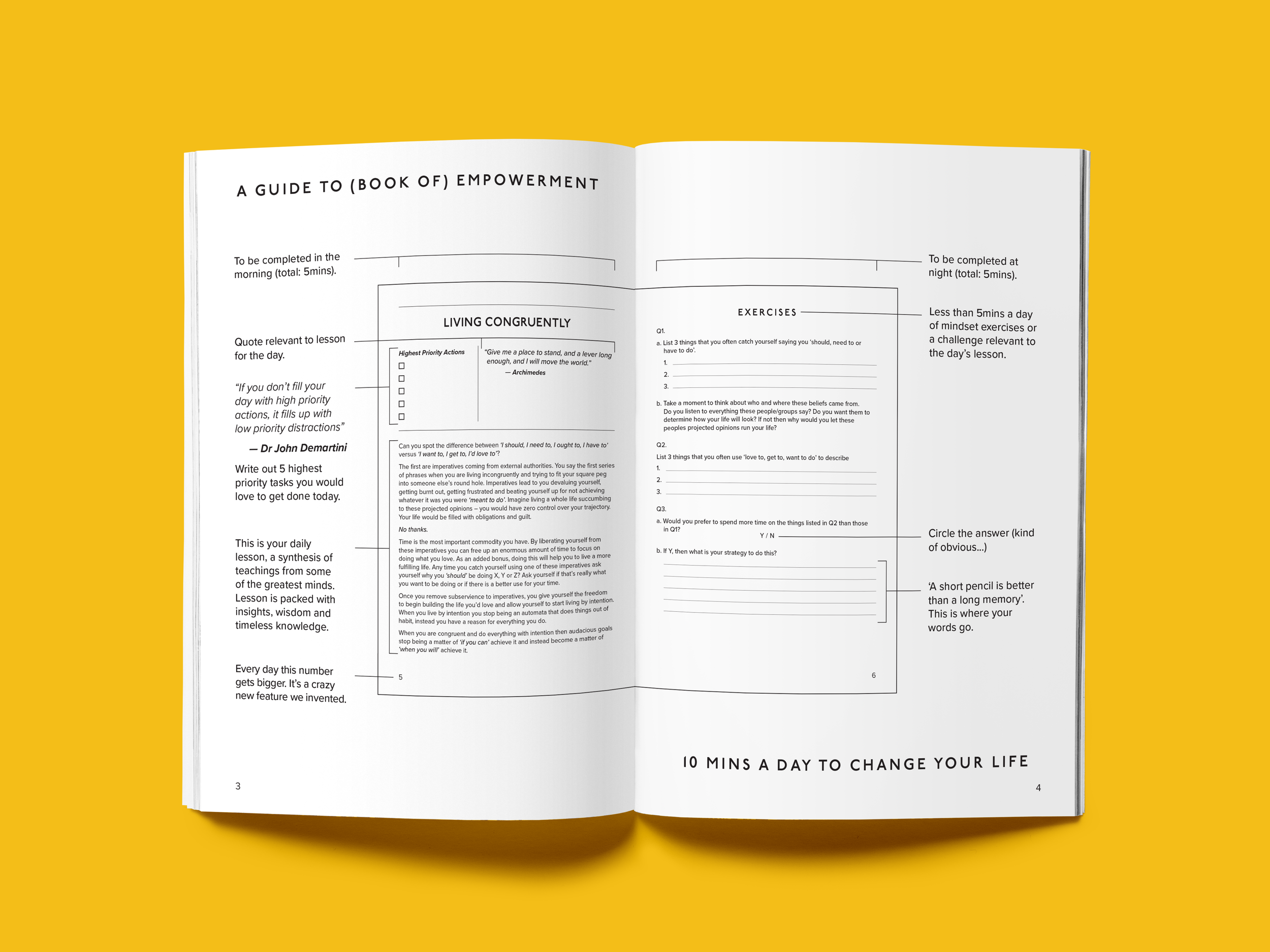Publication design created for The Empowerment Collective. This project involved typesetting a 250 page journal, complete with long text-based spreads, quotes, daily high priority actions and exercises to be completed by the reader.